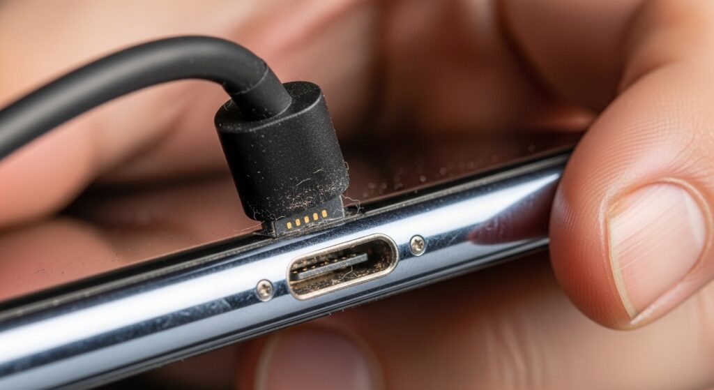 استخدم أداة غير معدنية مناسبة ولطيفة، ونظف برفق شديد مع الهاتف مطفأ. الهدف ليس “حفر” المنفذ، بل إزالة ما يمنع الكابل من الوصول إلى مكانه الطبيعي. بعد التنظيف، أعد تجربة نفس الكابل قبل الانتقال إلى استنتاجات أكبر.
