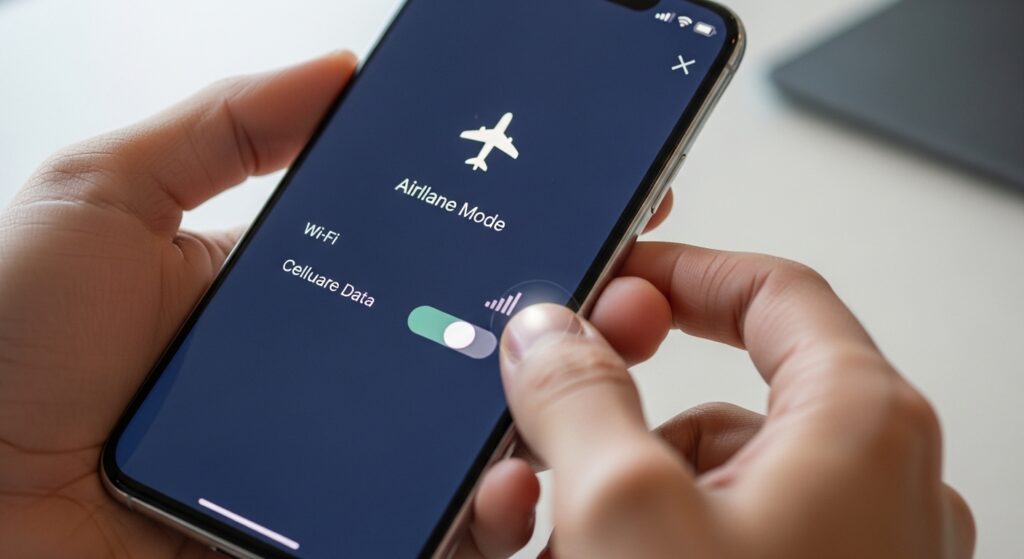 الخطوة المنطقية هنا ليست عشر محاولات متتابعة، بل دورة واحدة مرتبة: فعّل وضع الطيران من الإعدادات، انتظر قليلًا، ثم أوقفه من الإعدادات نفسها لا من الشاشة المقفلة أو من إشعار عابر. بعد ذلك راقب هل تعود الشبكة خلال وقت معقول. هذه الخطوة مفيدة لأنها تجبر الهاتف على إسقاط اتصالاته اللاسلكية ثم إعادة بنائها من جديد، وهو نفس السبب الذي تشير إليه Apple عندما تذكر أن تشغيل Airplane Mode يمكن أن يفرض “تحديثًا” للاتصال اللاسلكي. 2